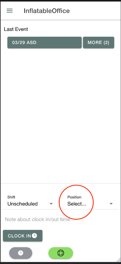 See attached, there should be a position drop down when clocking in. Do you not have this option? Please provide more details for developers.