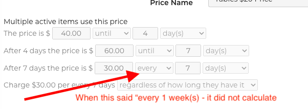 We noticed that an item pricing structure was listed as follows but the "after 1 week(s)" did not work. When this was reverted to "after 7 day(s)", it calculated correctly.