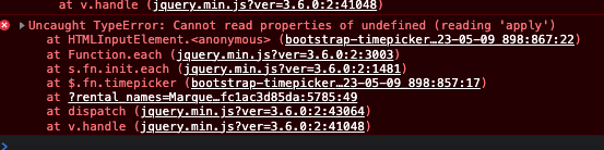 Once the Google Maps API key issue is resolved, another JavaScript error related to the Bootstrap Datetimepicker arises. This error prevents the form from functioning as intended.