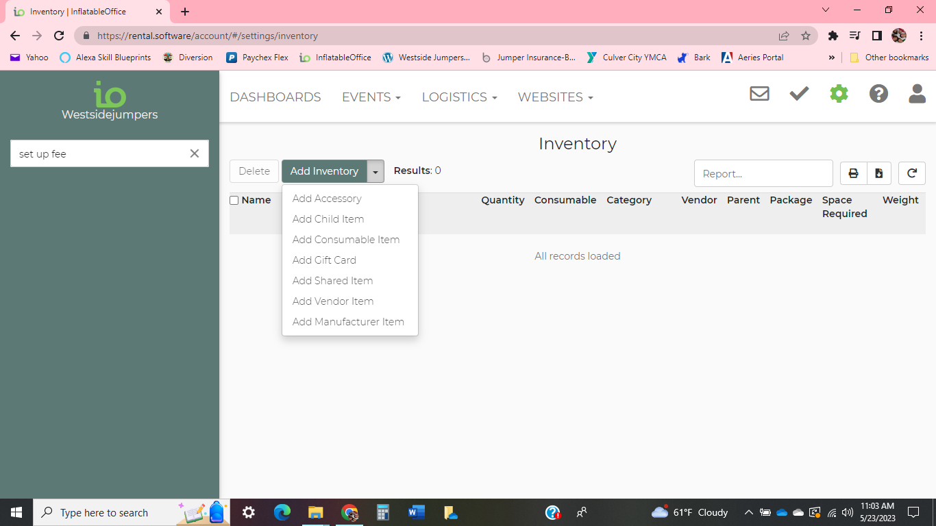 you have to add the set up fee to your inventory then attach it to the rental items you want it to be an option for the tables and chairs like you did with the generator for the bounce