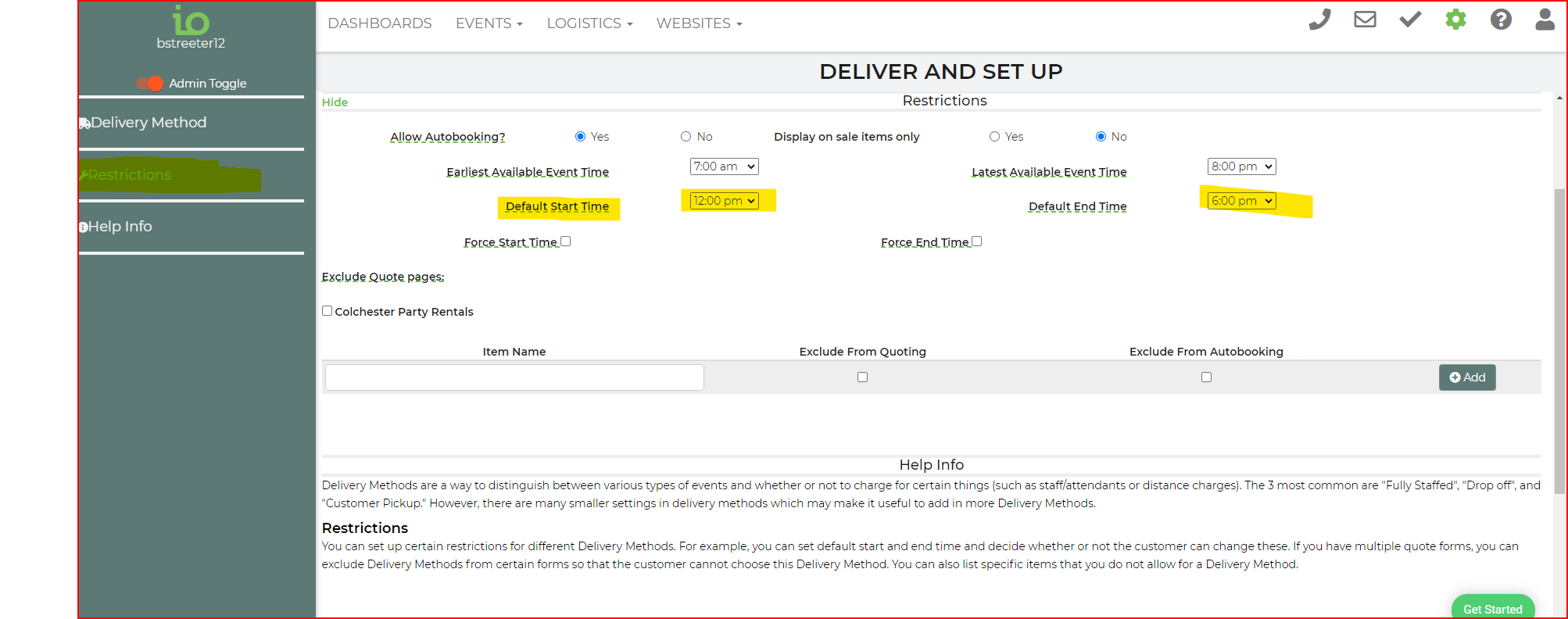 I've tried changing various settings and I cannot figure this out. My default event times keep defaulting to 12-6 and I don't want that. It will let the customer select their time, but once they actually reserve the rental, it switches back to 12-6. The only restriction I want is a party cannot start before 9am.