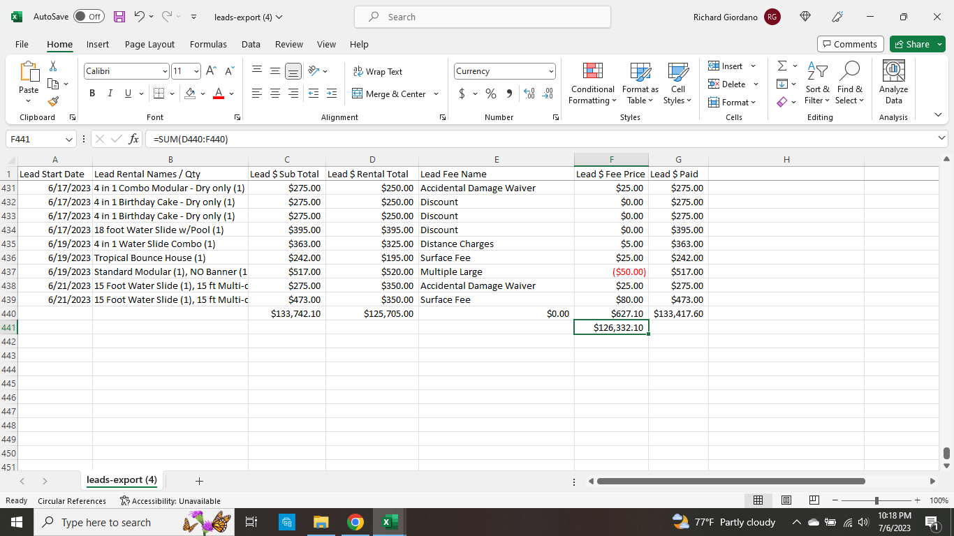 So, the problem I'm having is I know Every lead/reservation in 2022 has a Fuel Surcharge (Fee) of 6%. I also know that Most leads/Reservations in 2023 have a Accidental Damage Waiver (Fee) of 10%. So, the Fee's total should be much higher than $627.10 on $130k+ in rental sales, probably in the $8k-$10k range in Fees.