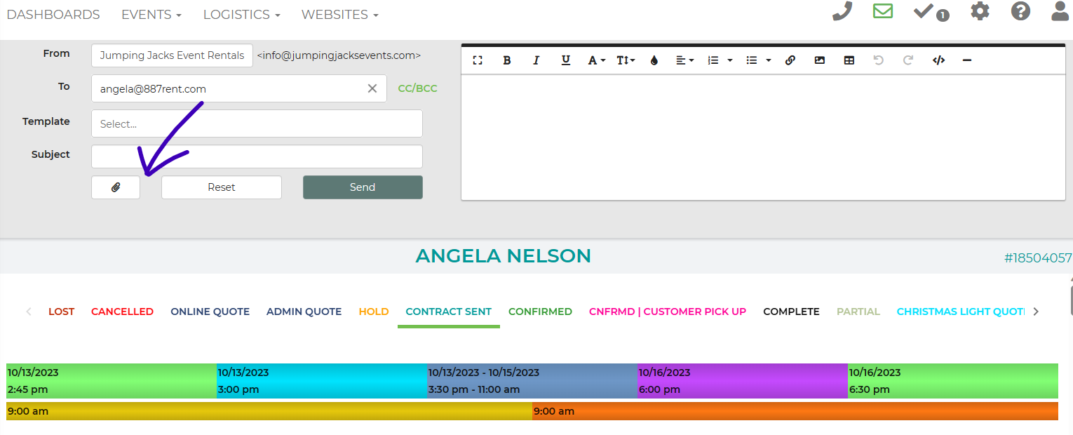 12acec47db2b419b575337a8694cade8Within the lead, click the envelope on the top right then click the paperclip shown by the blue arrow. Then click where you type in the attachment and one of the options is "invoice"