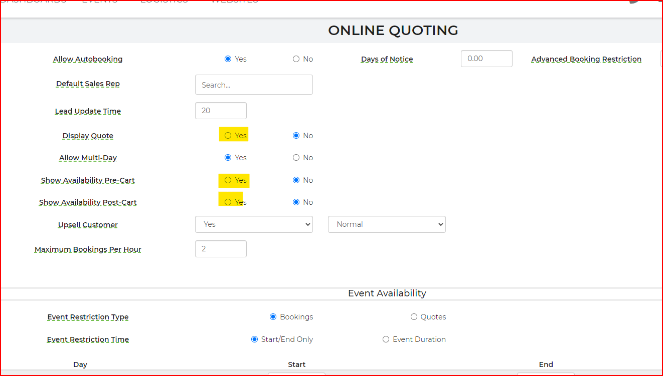 Please see screenshot, you should allow these if you want the customer to be able to autobook, just go to your Settings-->Online Quoting.
