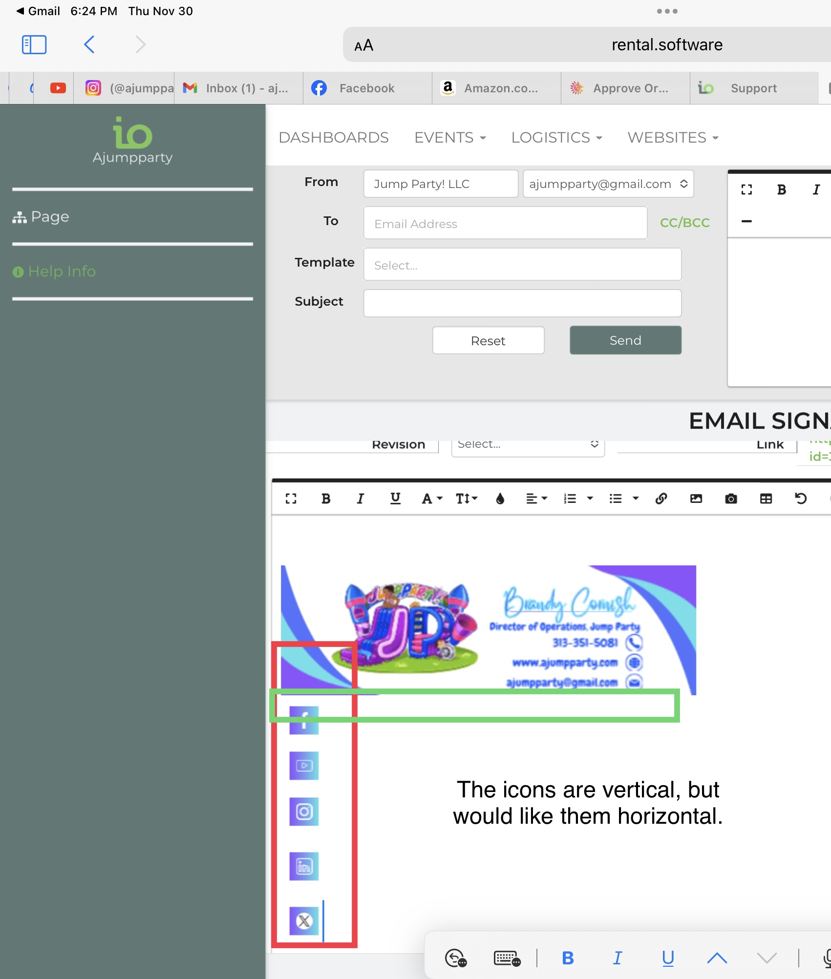 I added a email signature to my jump party account, but the icons are vertical and not horizontal. I went in front of the picture and try to delete, but it deleted the pic in front. I also added the email variable to the “things to know” email to test and I received an error. The signature wasn’t displayed.