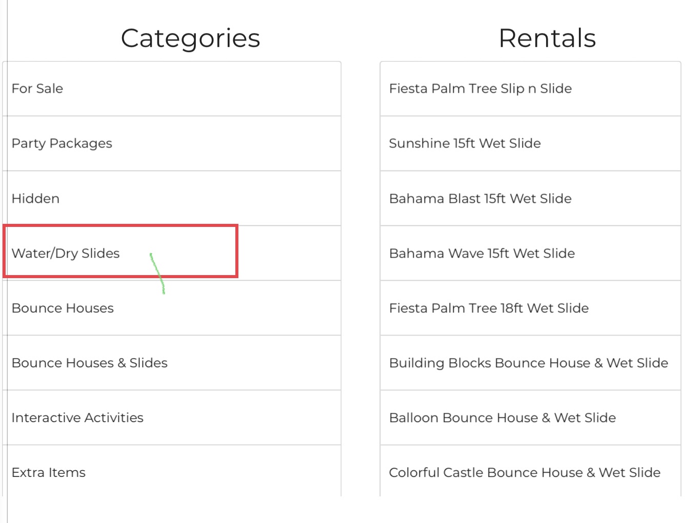 The categories are displaying fine. It’s the inventory items within the categories that are incorrect. If you click on Water/Dry Slide, you will see how the items should be listed, but when you go on the site, it’s not listed in that same order.