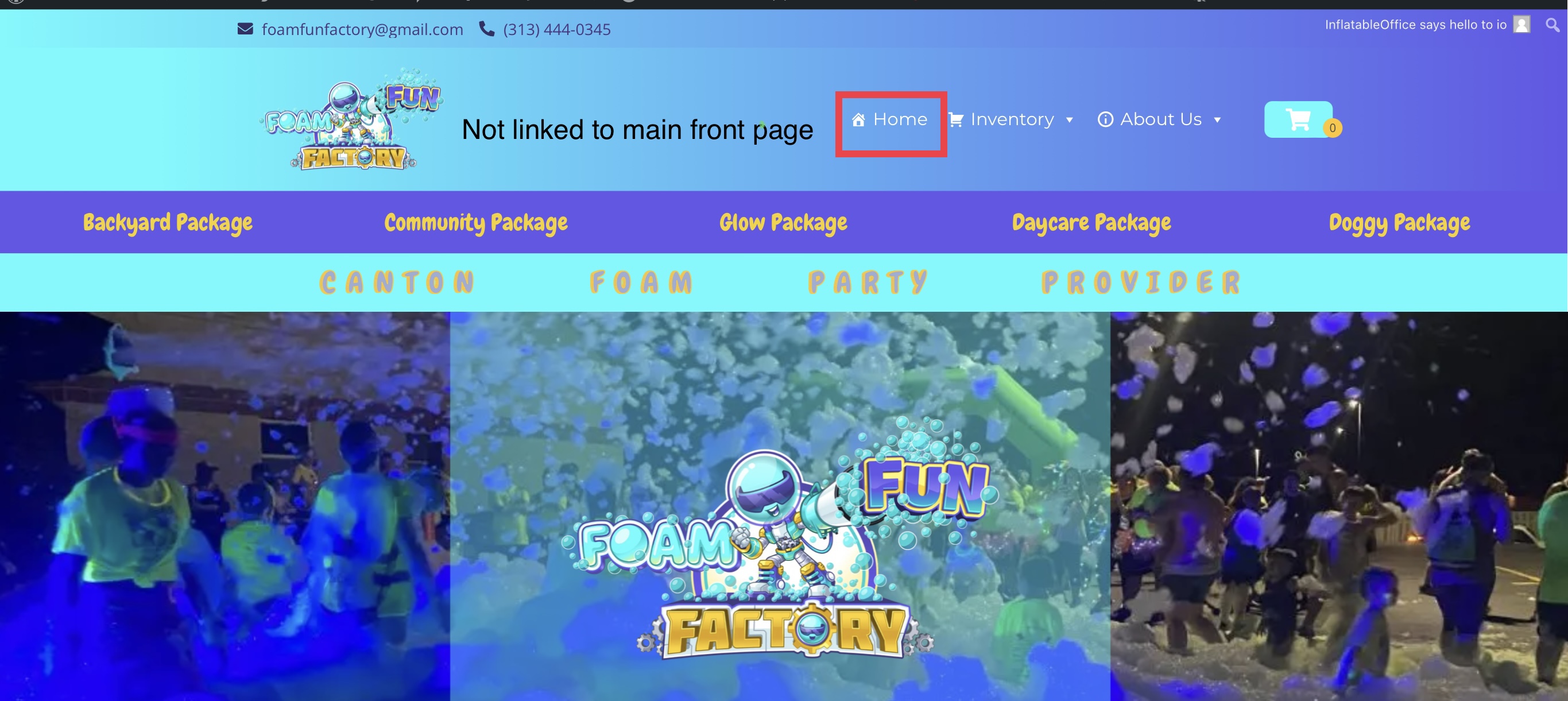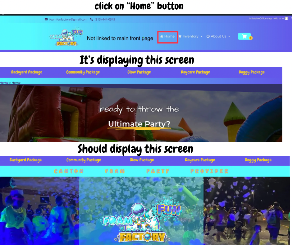 On the foam fun factory website, when I click on the “Home” button (see screenshot) it’s not linked to the main front page, but it looks like it’s link to an old/draft page. How do I change this? Thanks