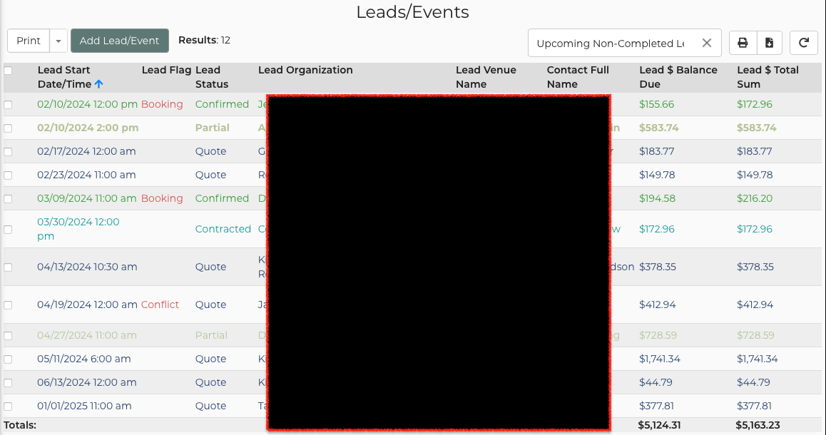 By default I'm most interested in the leads that are coming up soonest, but not those that have been completed. I want to know about all leads coming up -- contracted, quoted, hold, etc. all at the same time.