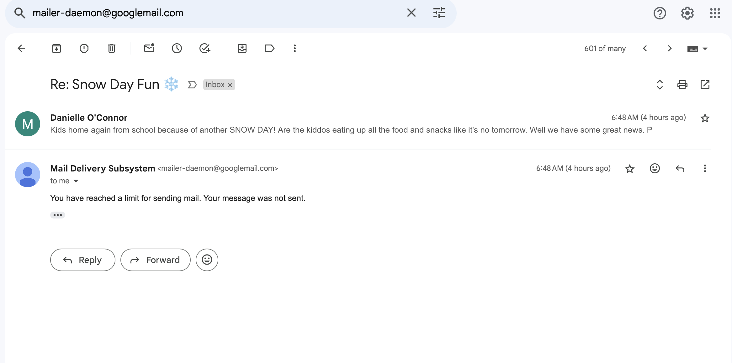 We recently sent a Newsletter to 23K contacts via our Gmail account. Come to find out that I.O. clearly says NOT to use Gmail accounts for sending newsletters because of their LOW limits. We now have +15K new email inbox error messages from mailer-daemon@googlemail.com stating, "You have reached a limit for sending mail. Your message was not sent."