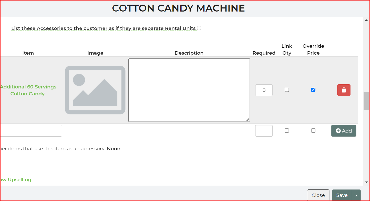Customers are renting our cotton candy machine and sno cone machine with the "Additional 60 Servings" Option and being charged $0.00, despite the item being priced. As far as I can see, there is nothing making this happen. On the lead, it shows the price of the additional servings being crossed out and saying $0.00 instead. It is active.