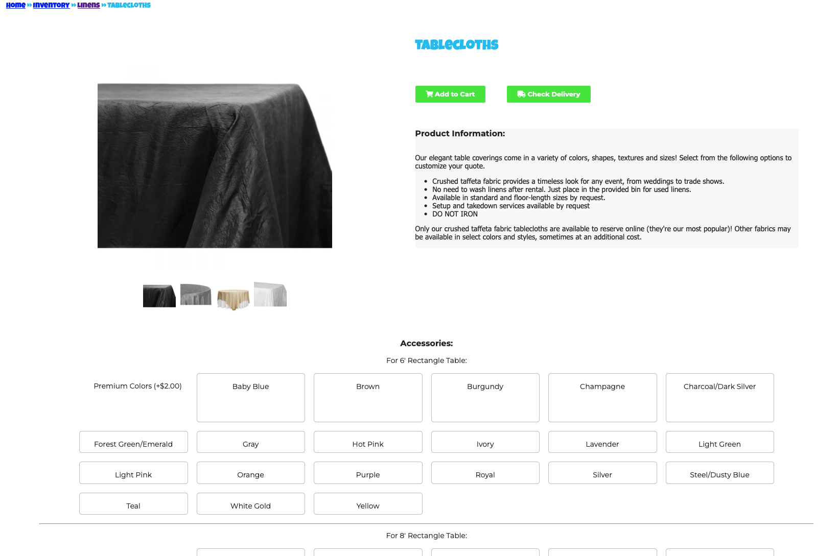 I rent tablecloths and have followed Joel's video to set up accessories for colors/sizes.