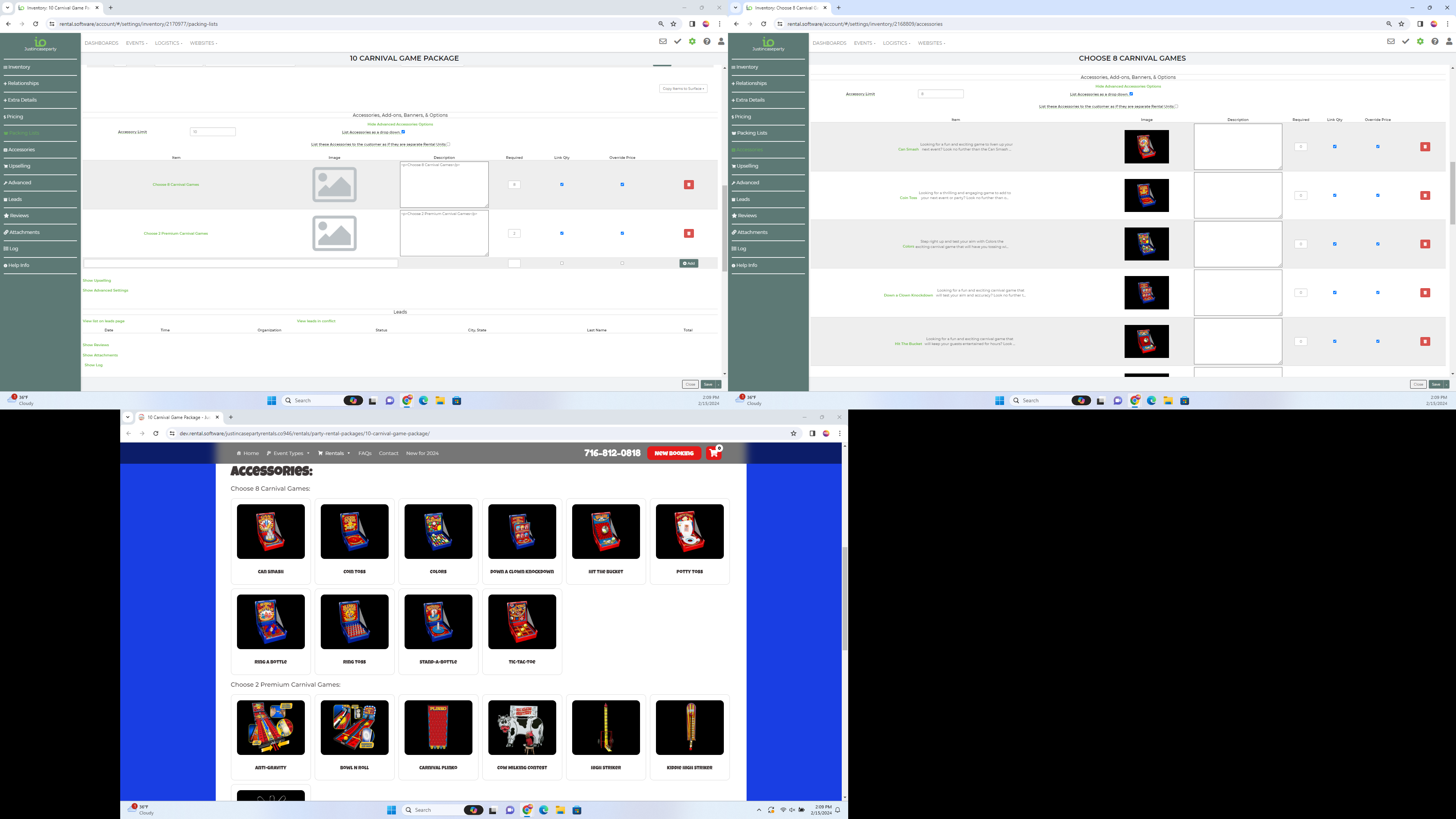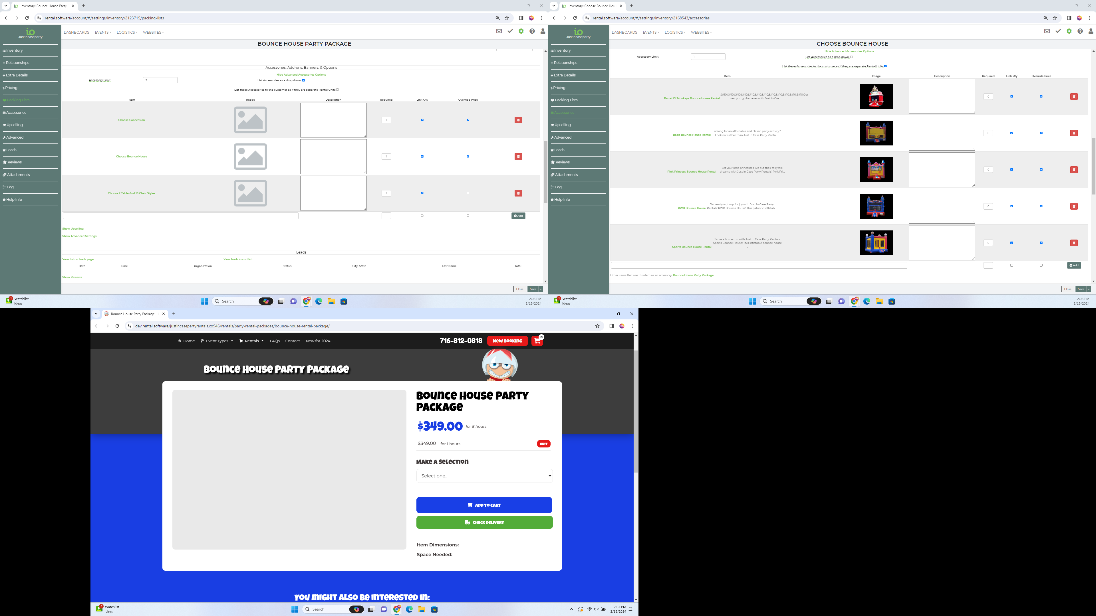 Now it looks like you have accessories set up for you tables and chairs as well as the basic bounce house. This is not going to work as it is listing an accessory to an accessory to an accessory. Going this many layers with your accessories will break the package on your website.