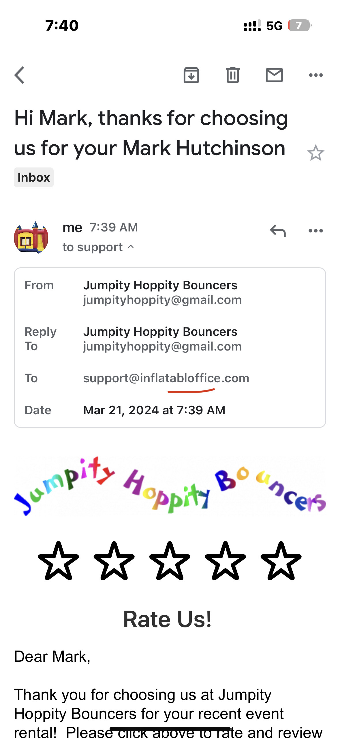 For the first time, a customer received their “thank you” email after their event which has the 5 stars at the top, that they can click on to leave a review and they left a 5 star “review”.