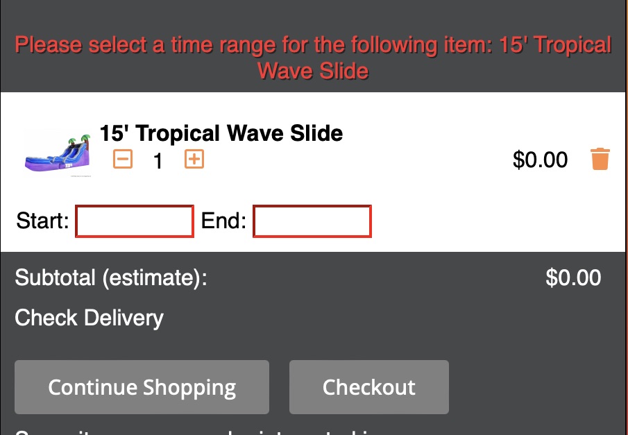 On my 15 Tropical Slide only, in the cart going to check out it makes the customer fill out the times they want only on this item even though the event date has been set. This is the only item doing this.
