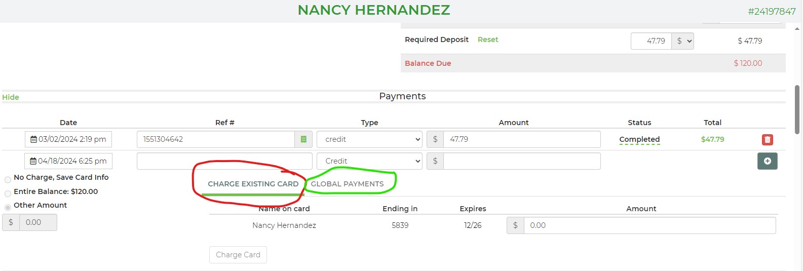 Hello, I may need to refund a deposit back to a customer. I use Global Payment. I see there's a video that was posted four months ago but the interface looks completely different than what I have under the Payments tab. Do I click on the CHARGE EXISTING CARD link (red circle in attached photo), enter the negative amount then click Charge Card, or Click the GLOBAL PAYMENTS link (green circle), enter negative amount in Other Amount box then click Submit? Thanks in advance for your help. Joe