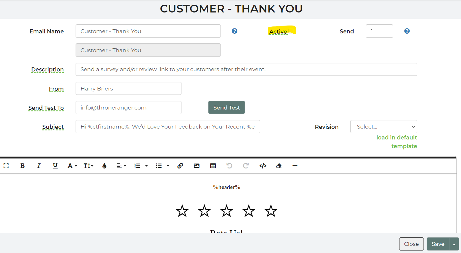 I thought since this was an automatic email you don’t have to click on the active box. The active box just makes it appear in the templates that you can select for the customer when you’re sending out emails, but I’m confused on automatic emails. How do you enable them or disable them?