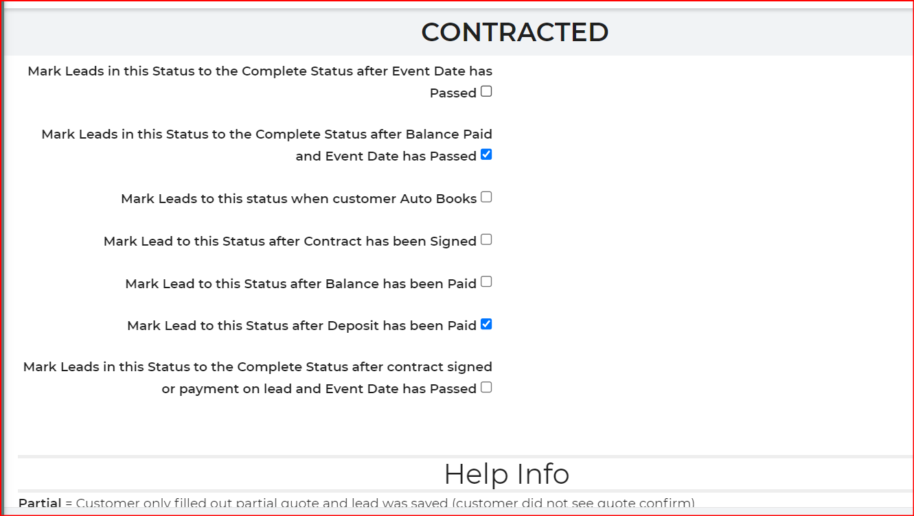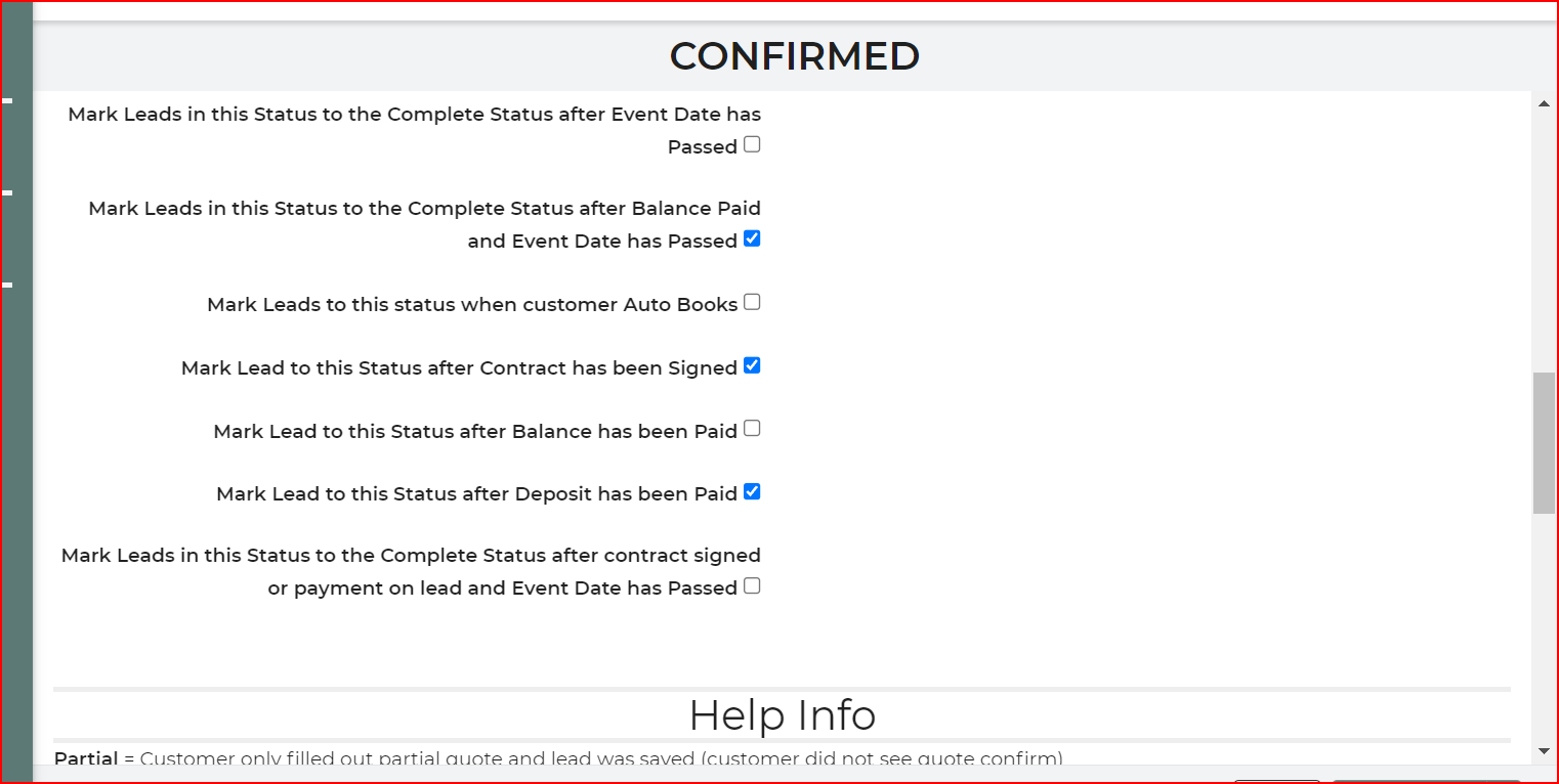 Also in my original message I said that the lead should get set to confirmed when the deposit is paid, I really meant contracted not confirmed, we do deposit first then confirmed when they sign. I don't know if that changes anything you were looking at. Thanks