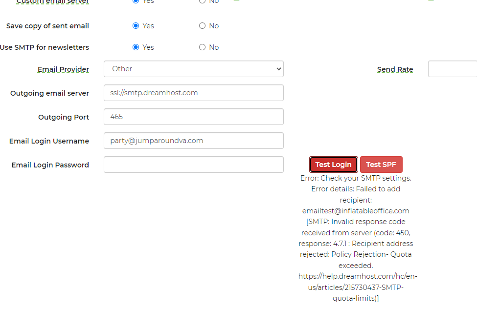 When I go to Settings-->Email Preferences and run the tests I am getting the attached error. Looks to me that the email server (dreamhost?) says you have exceeded quota? You may want to check on your account and see what the issue is.