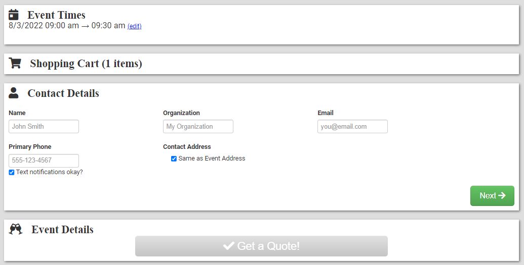 No we cannot add payment option there, that is the quote page and gives the customer their quote. When they click the get a quote button the quote will display w/ the pricing and everything, then they will have the option to "Book this event" when they click on that after getting their quote that will take them to the contract to sign and pay.