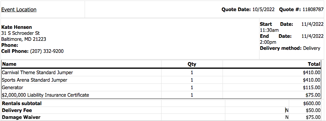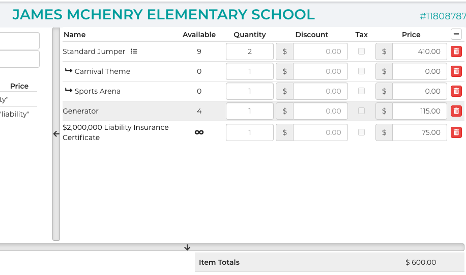 This school (LEAD#11808787) selected two (2) classic modular jumpers with two different banners totaling $410.00 which is correct on the "Rental" tab. However, when we switch it to an INVOICE each modular jumper has a line item charge of $410.00 vs $205.00. The invoice subtotal is correct even though the itemized charges are not.