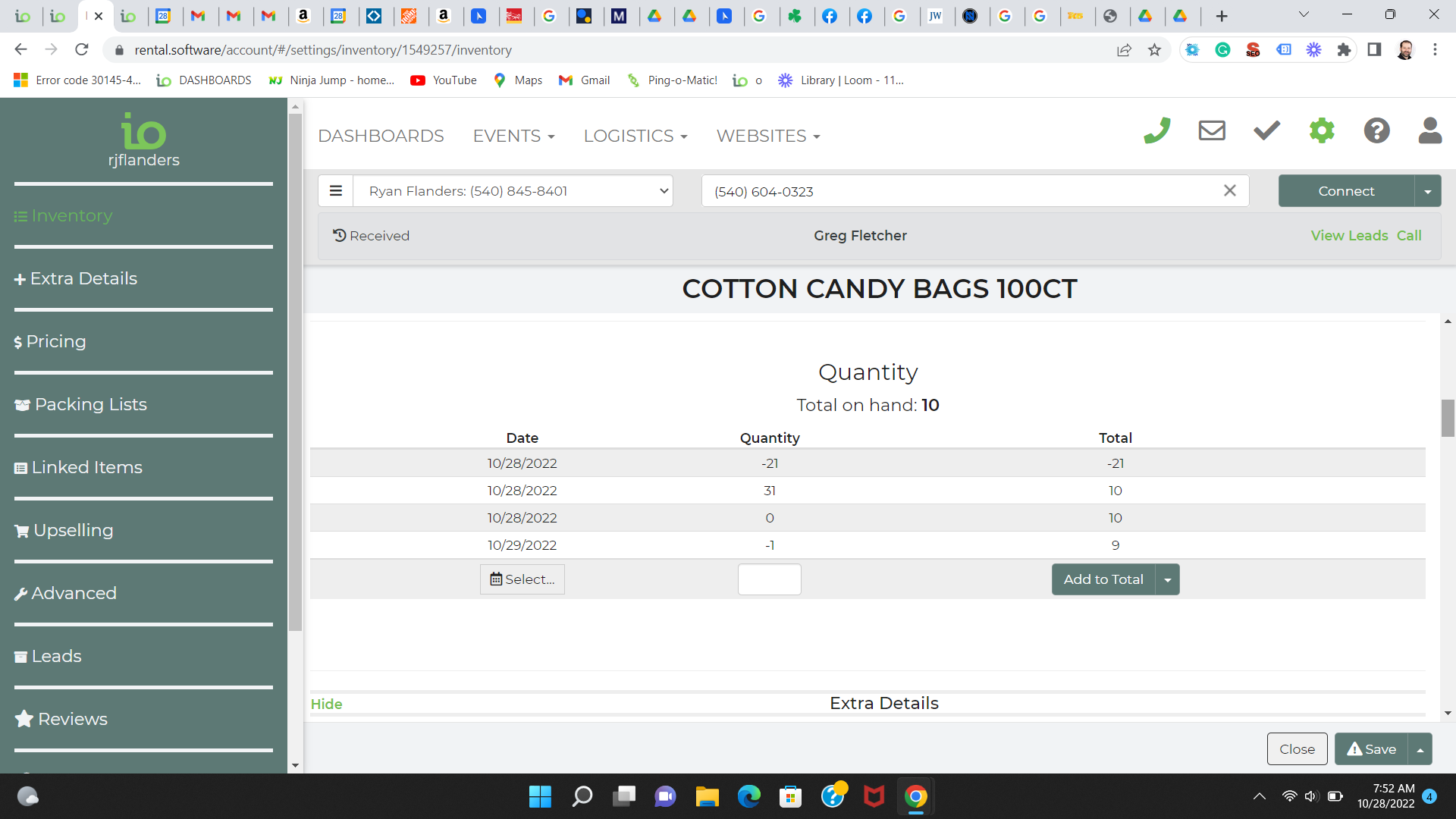 Can someone help me understand the quantity totals for consumables? for example, my cotton candy bags. I have 10, 100 packs and sell them in packs of 100, 1 at a time. I set my quantity as 10, but I do not understand the other numbers on this screen show. I only have one order on the 29th of October that uses 2 packs, but it says -21??