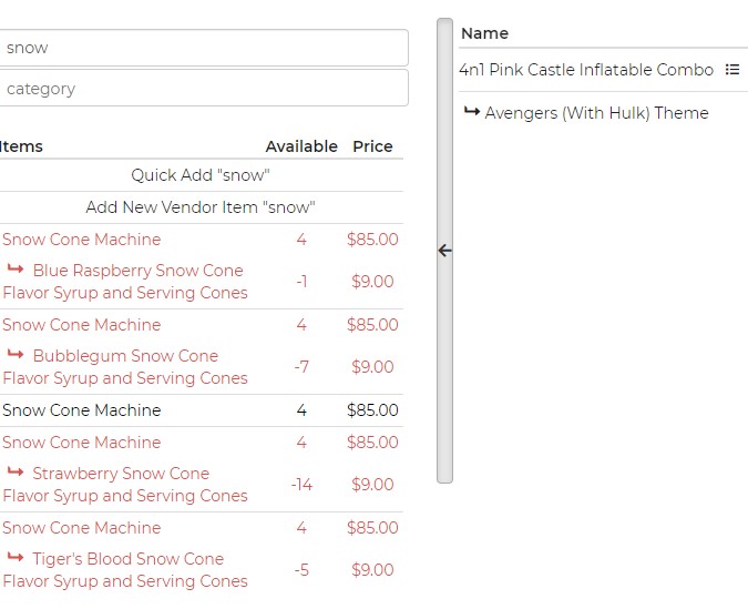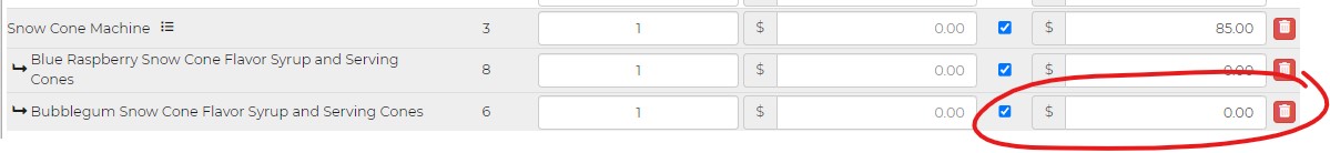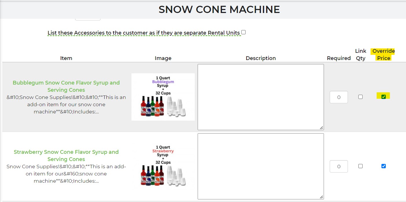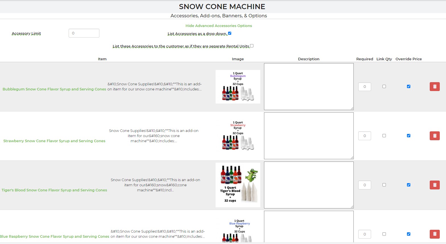 - The snow cone machine was set up with optional accessories, set to display as a drop down menu so they could choose their flavor, and I overrode the price so customers aren't charged extra for the supplies.