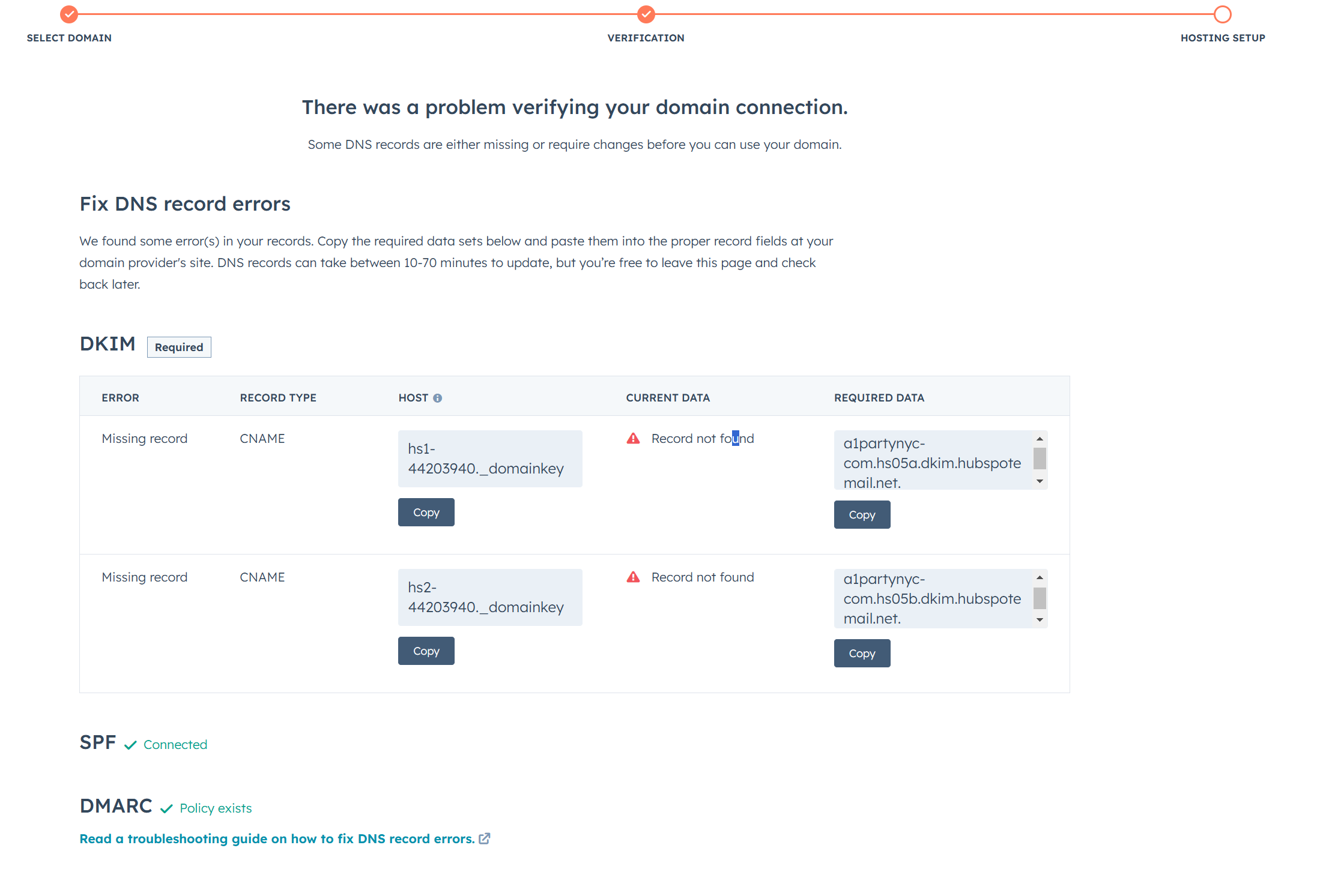 I’m working on verifying our email with HubSpot, which requires adding a CNAME record to our GoDaddy DNS settings. However, I encountered an error when attempting to add the record (screenshot attached).