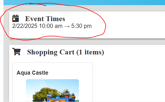 This is due to your item settings. It looks like on a few items in Inventory-->Advanced Settings you have "time instead of quantity" checked which makes the customer choose how long they want the item for rather than the customer having the item for the full duration of their event time in the cart. You would need to uncheck this box. If you click "change date" on the cart this will allow the customer to choose their event time but the time pickers under the rental item is due to the time instead of quantity setting I told you about previously. On the checkout page the time pickers have been removed are you also wanting them to be removed from the cart as well other than from the section showing time pickers due to your settings?