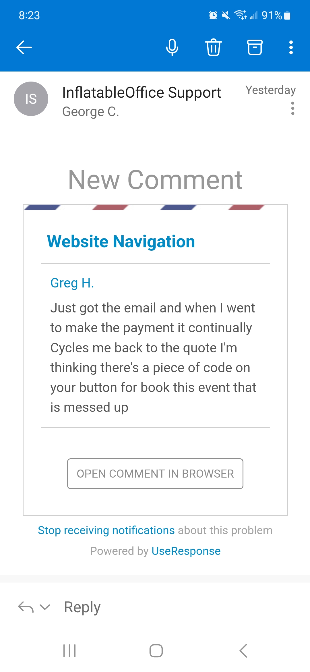 Below is a screen shot that I took when I sent an invoice to myself. I also had a neighbor do the same thing. She received the invoice and she said that it did not allow her to make a payment. It kept taking her in circles. She was redirected back to the website over and over again. This is a complaint from a current customer and few before. I had to go and do manual payments for those customers. I also noticed that when I tried to get a quote on my phone, I noticed that the specific information about the rental was not viewable on the phone. I couldn’t see the dimension requirements, electrical requirements, etc.