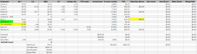 attached are images of my spreadsheet. The export is what I get from IO filtered by date and employee. The calculations is the section of the sheet where I do all the calculations.