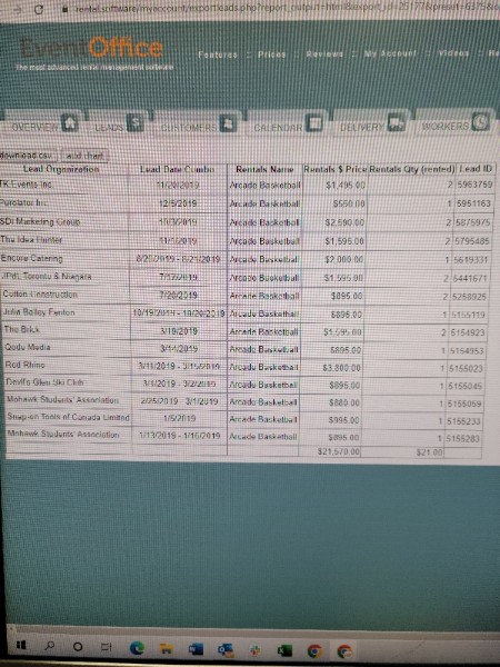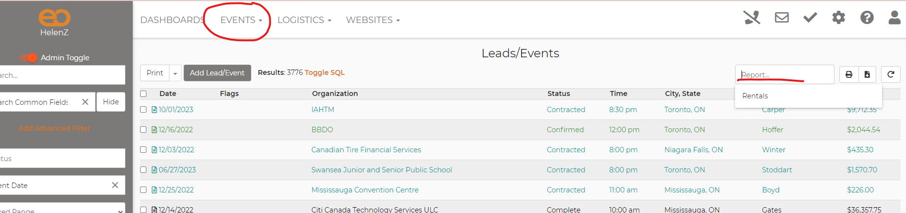 On the top of the page click on Events-->Leads. Once there you will want to Choose on the left hand side the Statuses (Completed?) you wanted to filter out. And the dates....Event date...Select (with the calendar icon choose your date/time frame you want to filter out). Then on the upper right hand side you will see a box that you can choose your report (see screenshot)