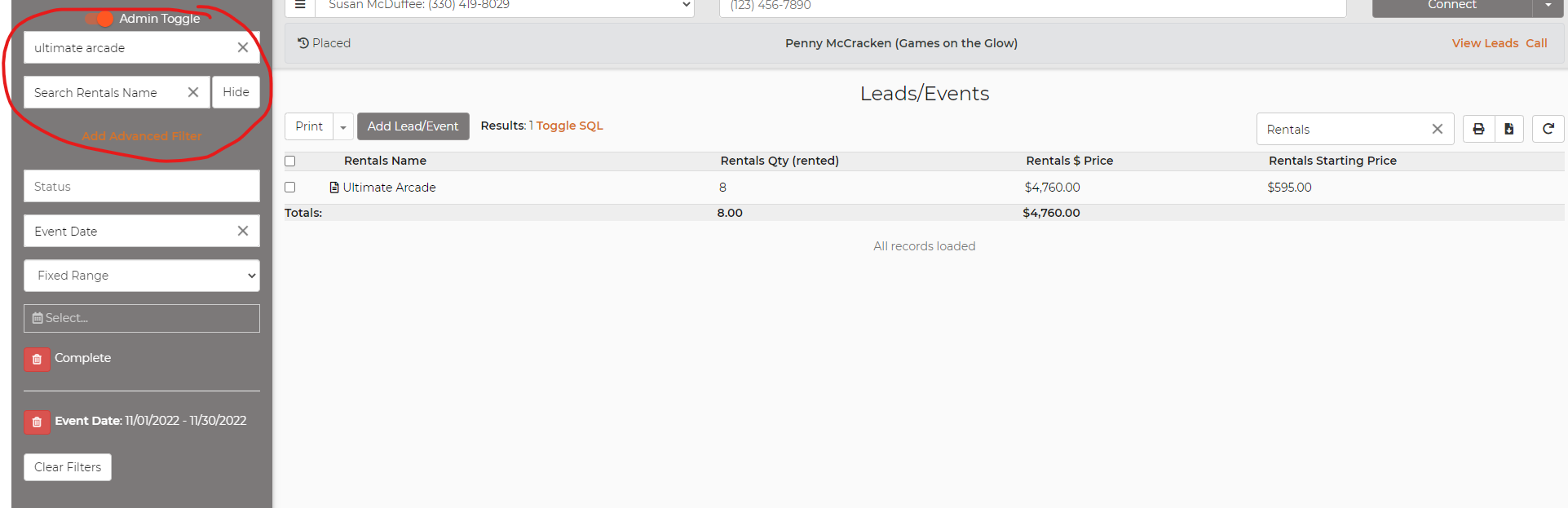 If you create a report to see rentals on leads there wouldn't be a way to pinpoint just one rental...it would show you all of the rentals on the leads that are rented