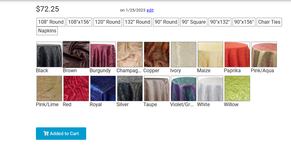 I have all my linen pages built, thank you for your help. I am trying to figure out how to display the price after the fabric type is clicked without the customer having to add the item to the cart. I don't have the price restricted on the table cloth size, fabric, or color. Can you point me in the right direction here?