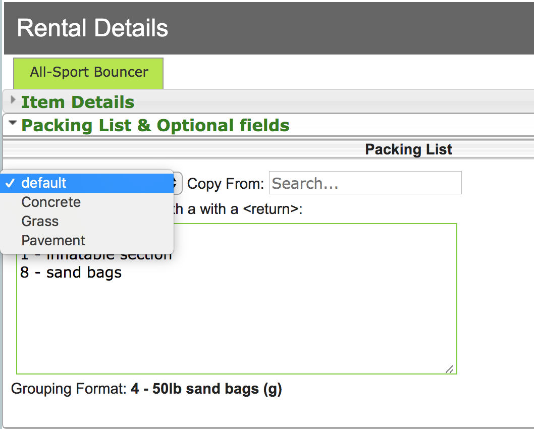 One way to do this is to add a packing list for each type of surface (see screenshot) You can set up a separate list for grass, pavement etc. This won't add the items as an accessory on the lead, but it will show up on each packing list