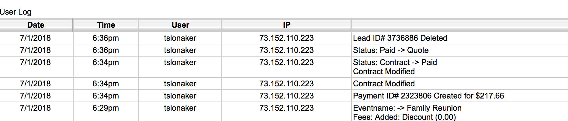 A regular customer, William E Burley, boks an attraction every year for a family reunion. In 2018 his booking disappeared from our books and we almost missed bringing him his rental but fortunately he called and we manged to rush it to him. When trying to understand what could have happened to his booking, Mr Burley sent us an emailed receipt for his payment which was for the correct amount to book his inflatable for 7/21/2018. When we went back to his history we could not find any event logged in for any date after his 2017 booking, and we are wondering how we might have somehow deleted his contract by mistake. Is there a way to check to see how, why and when that could have occurred?