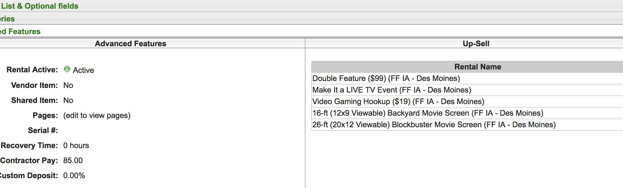 Under each inventory item you can edit under "Advanced Features" Here you can add/delete which items you would like to come up as up sell rentals.