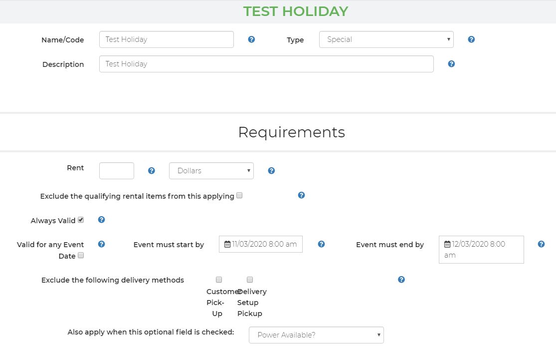 Hi. I can't seem to work out how to do holiday pricing. I've set up a test hire from 8AM 10th March to 8AM 12th March so that's 48hrs. In my pricing it's $10 for up to 24hrs then $2 for every extra $24hrs so the total should be $12 which it is except that I've also set up a special from 8AM 11th March to 8AM 12th March i.e. the second 24hrs of the rental which is 100% discount. i.e. they shouldn't be charged for that day but for some reason they are. See screenshots attached. The idea is that I don't want to charge for public holidays. Appreciate any thoughts. I've spent a few hours on this but can't work it out.