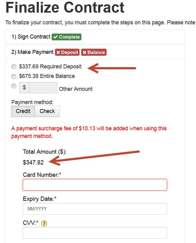 4086567Lead, but have heard from other customers. When I View the contract, it tells them it is going to charge their card the deposit and CC fee, but no radio button is selected. Customer thinks they have paid, and are confused when they get an auto-email reminding them to pay.