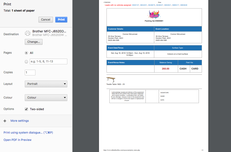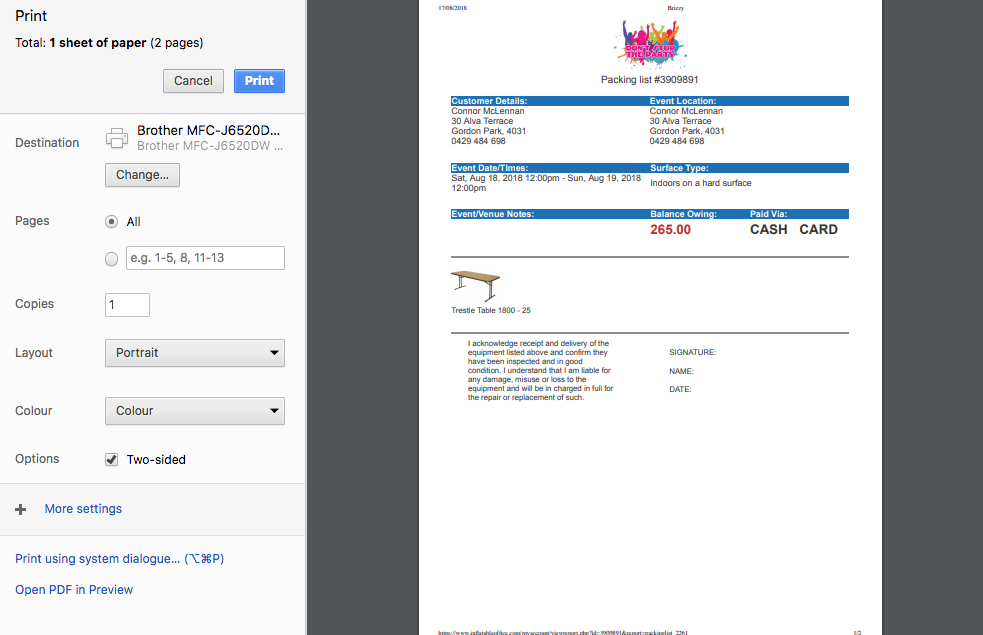 When we "view" and print from the template page of the packing list, the layout we created works fine.