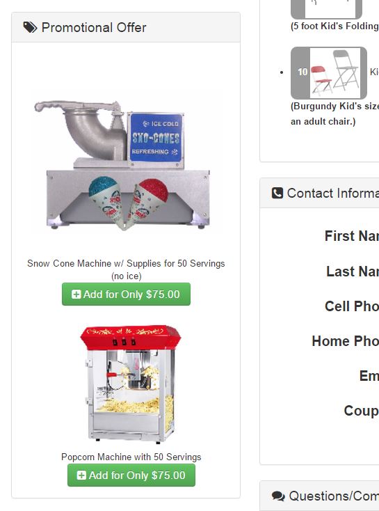 I have a promotion that the customer can get $10 off of a concession machine if they order a bouncy castle. To generate upsells.