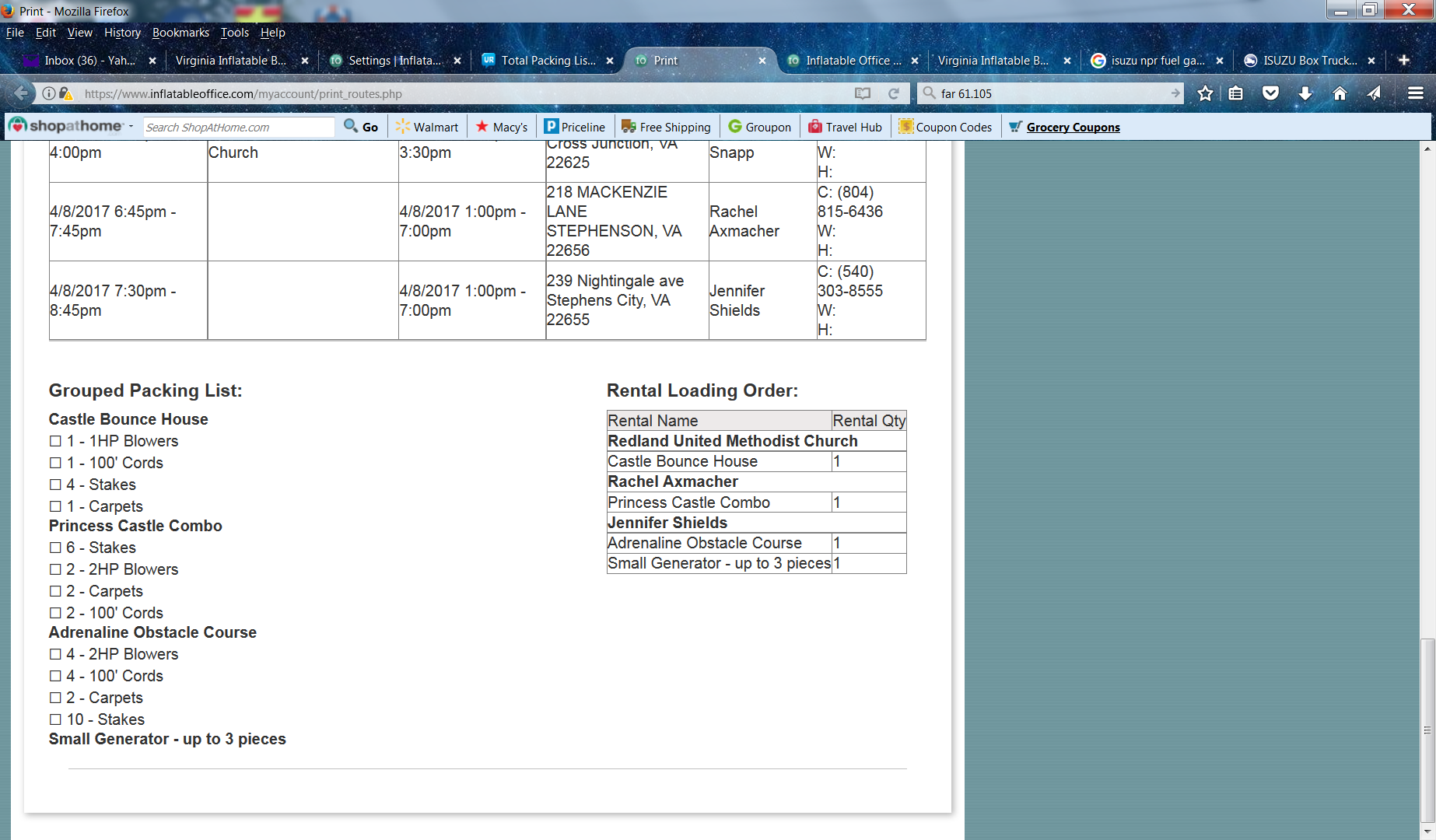 In order to get items to show up and total under the "grouped packing list," you have to add a (g) at the end of the packing list item's name. We don't do it by default because some people want just some items grouped together, but not others. For instance, it's almost always fine to just total up the number of stakes because you can put them all near the back of a trailer/boxtruck and still get any inflatable around them, but if you loaded 10 blowers at the door, you might have to move them all out of the way to get your first inflatable off the vehicle.