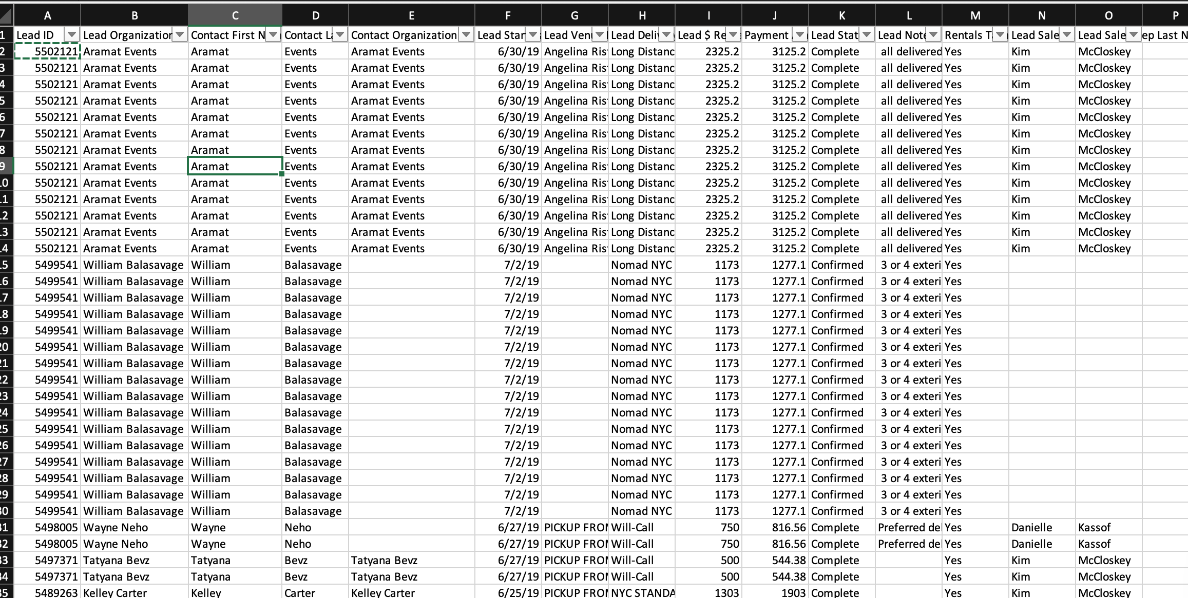 Anything starting with "payments" will give one line per payment, and anything starting with "rentals" will give one line per each rental item. I believe all the other fields just have one per lead.